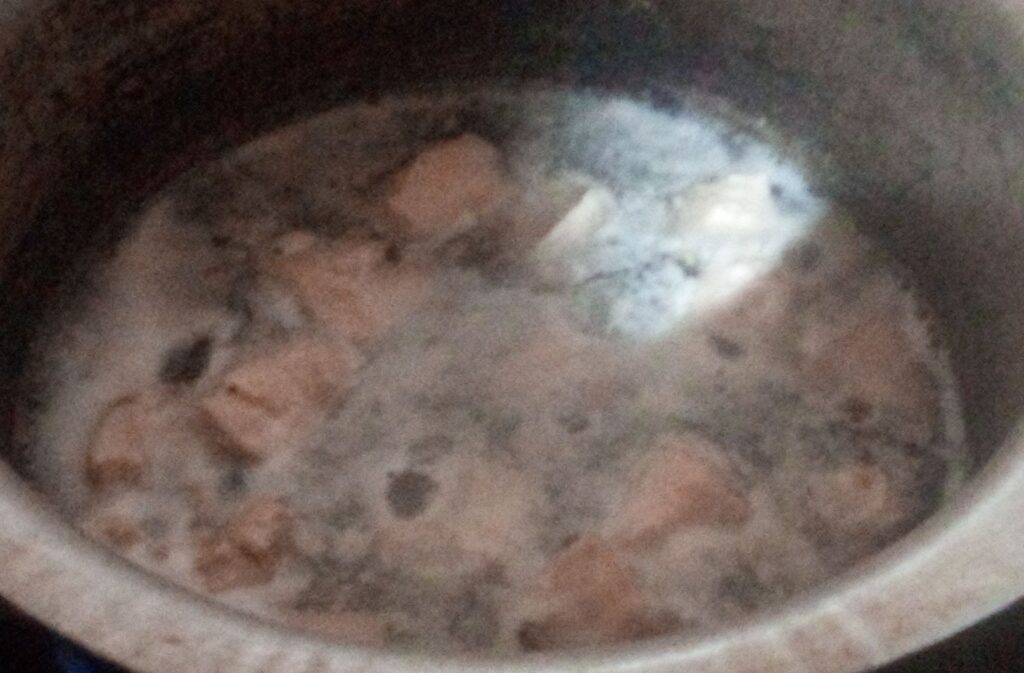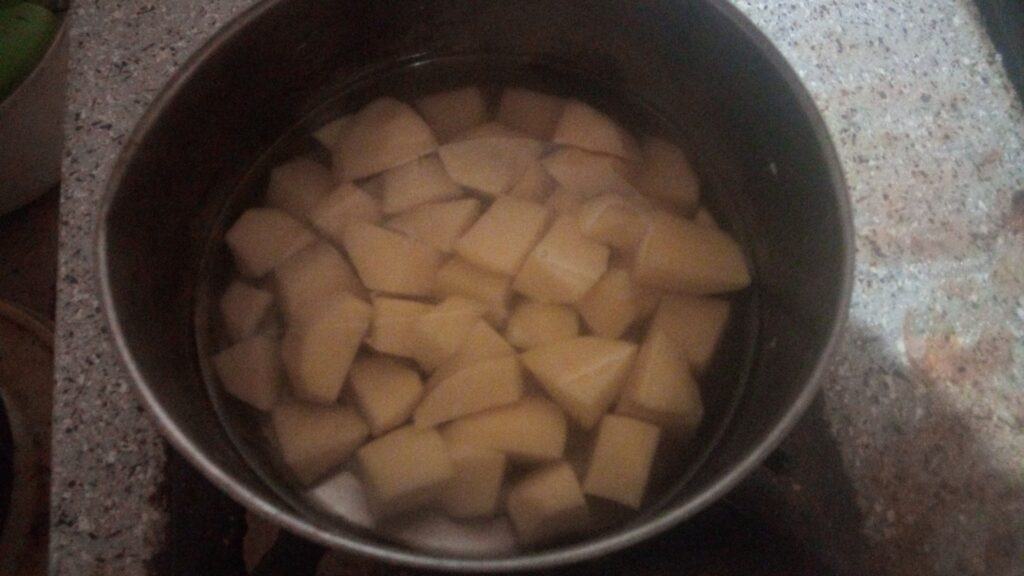 Next, you have to add those potato and chicken segments inside separate steel pots, add some salt inside the pots, and boil them for 10-15 minutes or as needed. Plus, let your boiled potato and chicken pieces cool down after placing them in a bowl.