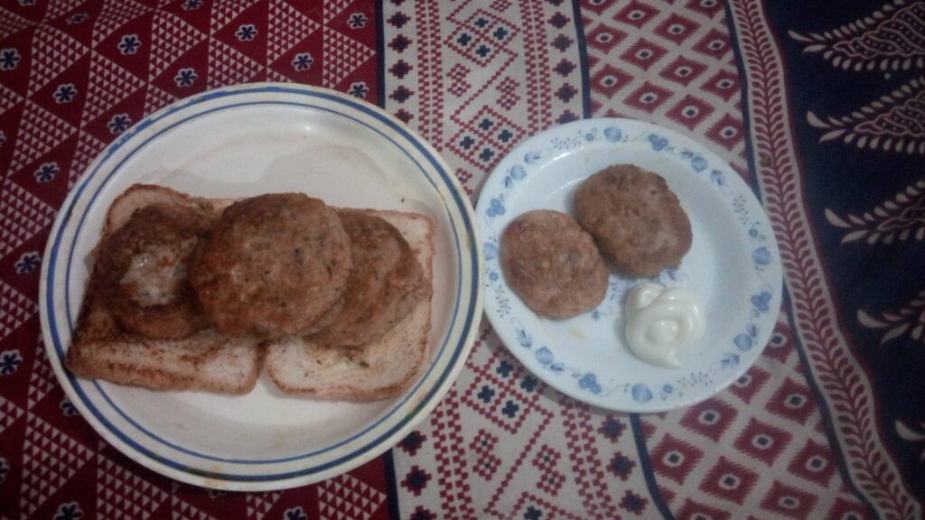 Well, now is the time to serve these cutlets. You can move these cutlets from the pan to your serving plate and add some tomato ketchup, mint sauce, or mayonnaise on the plate. Then, you can serve the dish to your family members or guests that they can enjoy with toasted bread pieces as shown in the picture below or toasted burger bun pieces.
